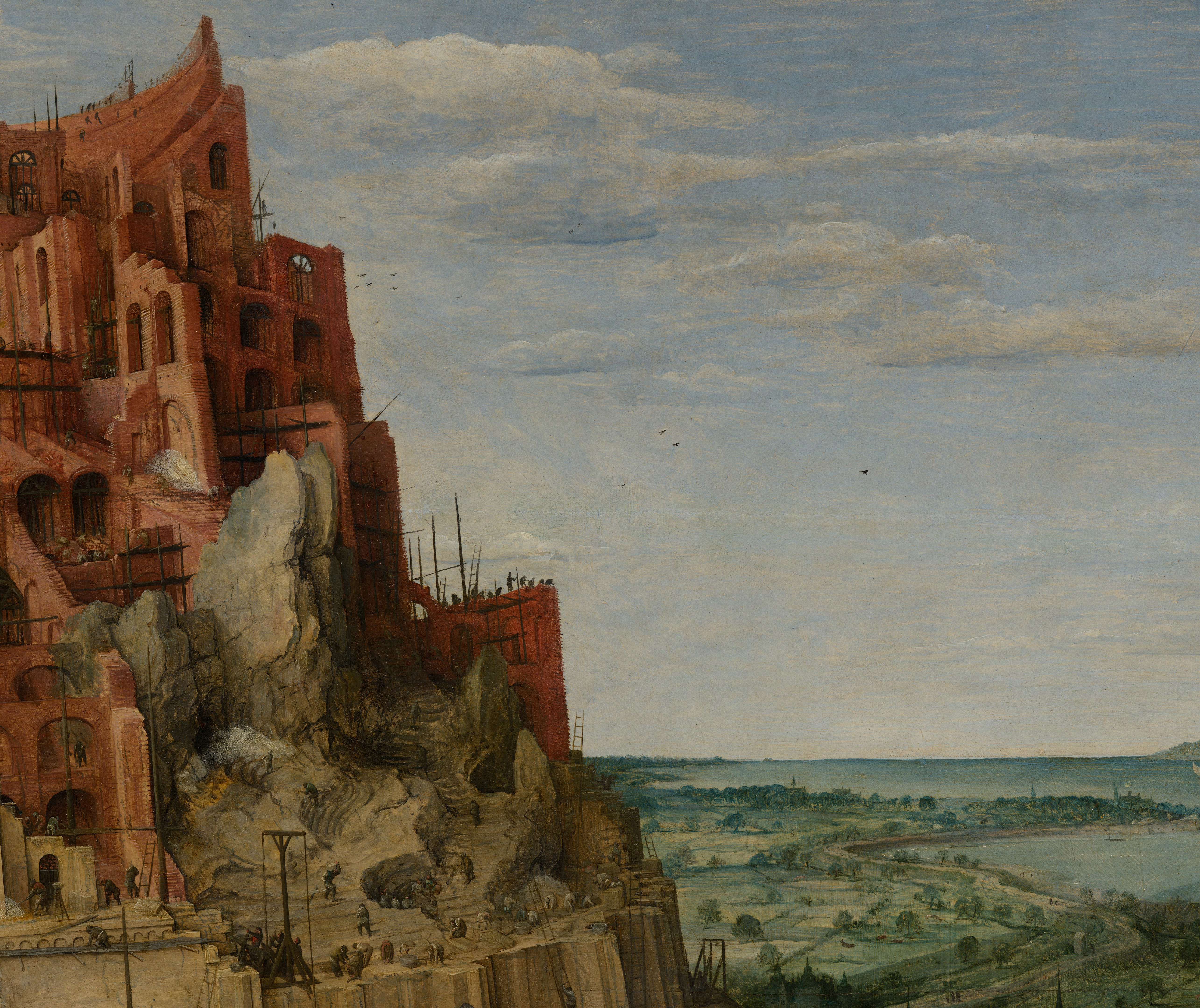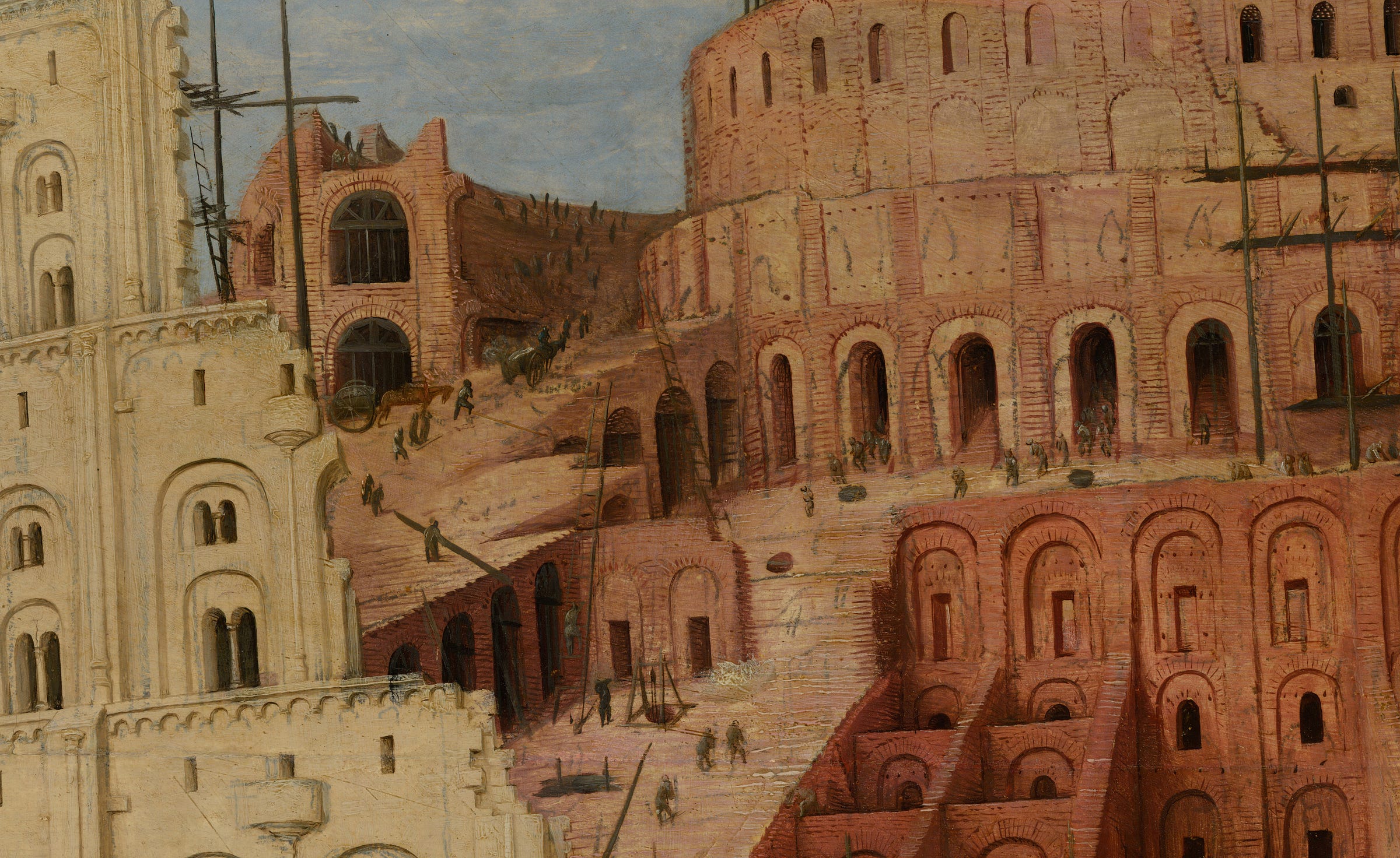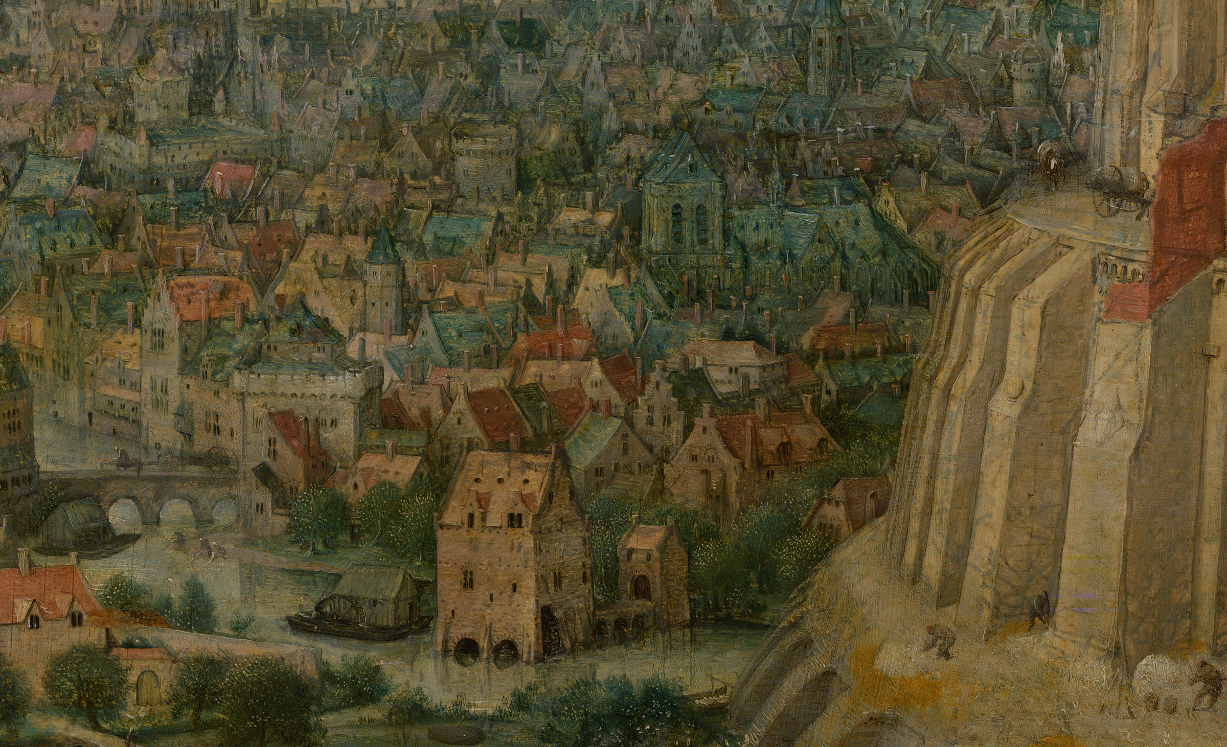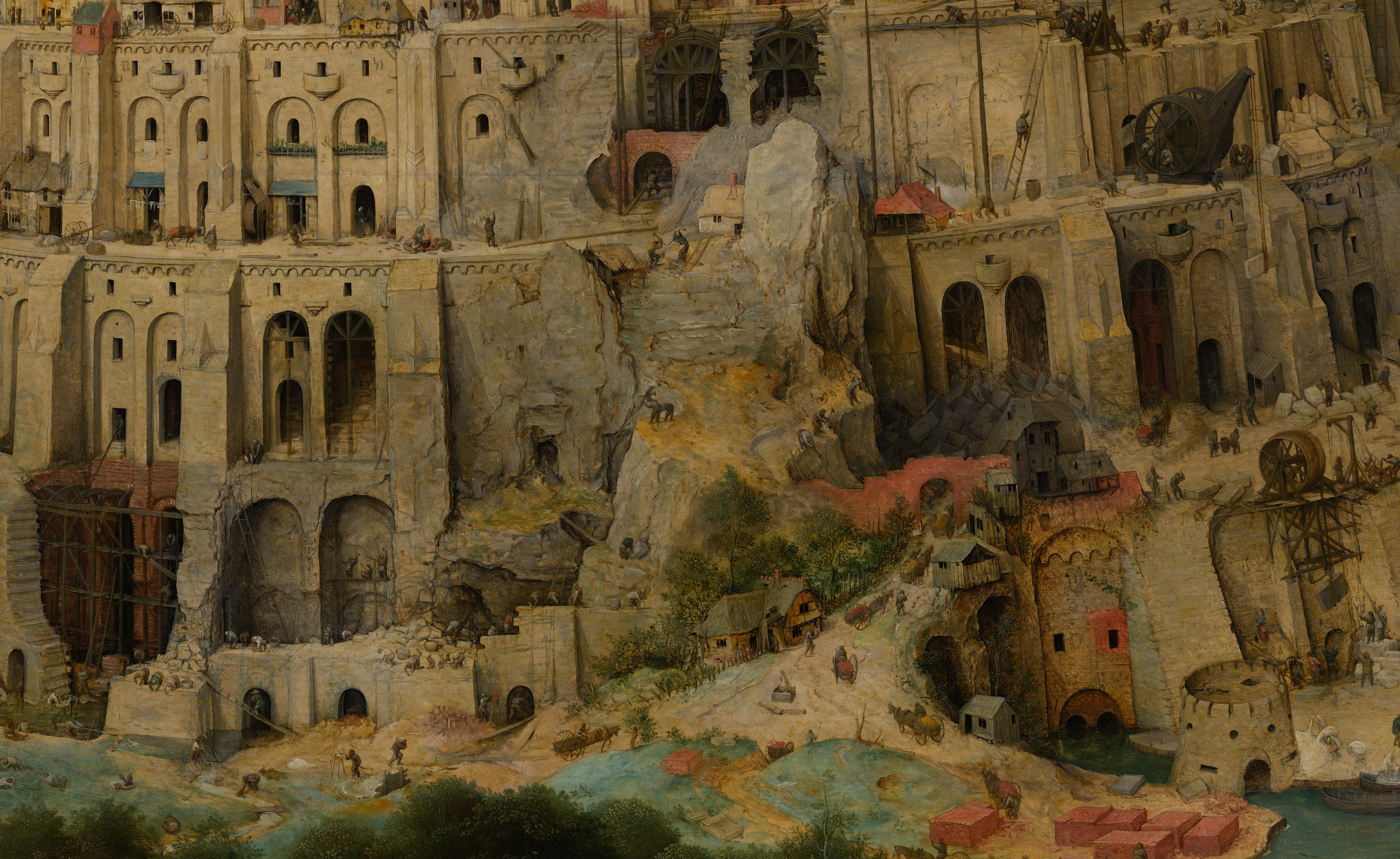 The city and the Tower it’s belittled by: Open in extreme wide as in Bruegel. The Tower’s grandeur, buttressed by port, city, sky, in its unfinished design figures ambition’s folly and imposture. Walk its several sides, it cannot be encircled. Remark how at every angle it seems absurdly self-similar until the sense becomes a sinking one that there are infinitely many sides. What need for it, though? Don’t we have them already? If it were up to me there wouldn’t be any. If it were up to me it’d’ve been done long ago. There was a time, it’s said, when they began it, brought together to set it down somewhere in the city where a Tower did not yet exist. No one can verify but all are free to add, brick by brick, their clarifications, and as it rises be raised by its immense awareness. But the Tower… it houses at its center a huge mass. It bends nature and our wills around it. Scabbing masonry, roads unfinished, overgrown, flights of stairwells, vaults and arches and crypts to peer into its darkness. Unmade, yet among arcades, a space where a temple’s falseworks lay, how it might have looked one day if there were a sacred, needful place… One age culminates in astonishment, then turns to stony reverence. The next inherits it, unimpressed, often incredulous. They too are on their way to astonishment. They will take up the work and fashion it in their own image, an image of the same Tower, layer upon layer, recursive. Golden in ratio. Always unfinished yet symmetrical. Ancient and new. Answering a dreamy prayer. Cleaving heaven in two. The Tower’s myth the boy made real the granted wish. Wisdom is in remembering this. So colossal so hyperbolical those who work one side do not know what on the other side goes on. The right hand does not know its left. Yet we’re certain we know our neighbors are not like ourselves. Men know their neighbors better than themselves. It will not be finished in our lifetime. It may not be finished in any timeline. Still it rises. Still it’s raised. Still spacetime ekes out infinity never knowing itself completely for we’ve arrived cosmically and what there is to know cannot be known by accident. The right hand will never know its left.