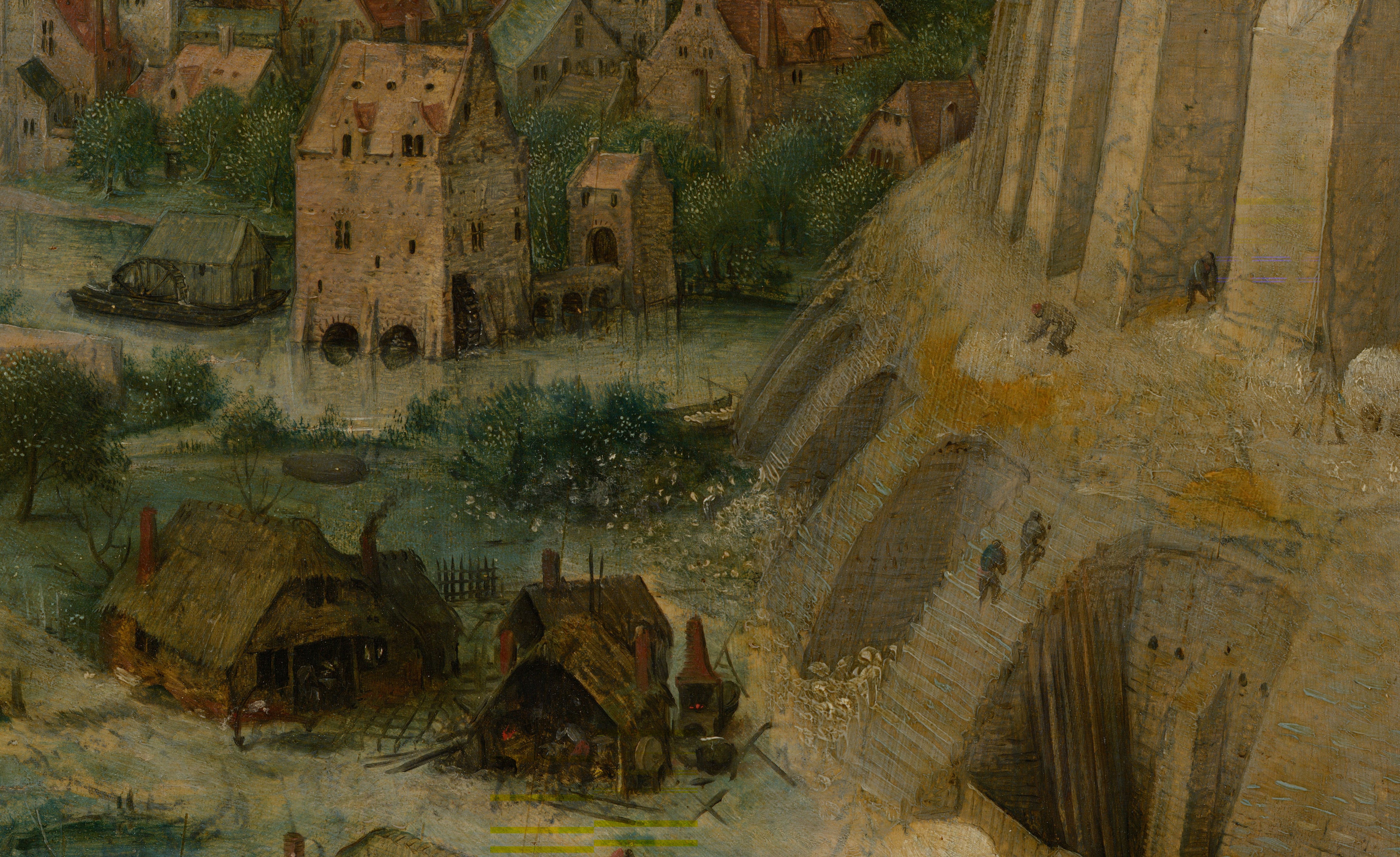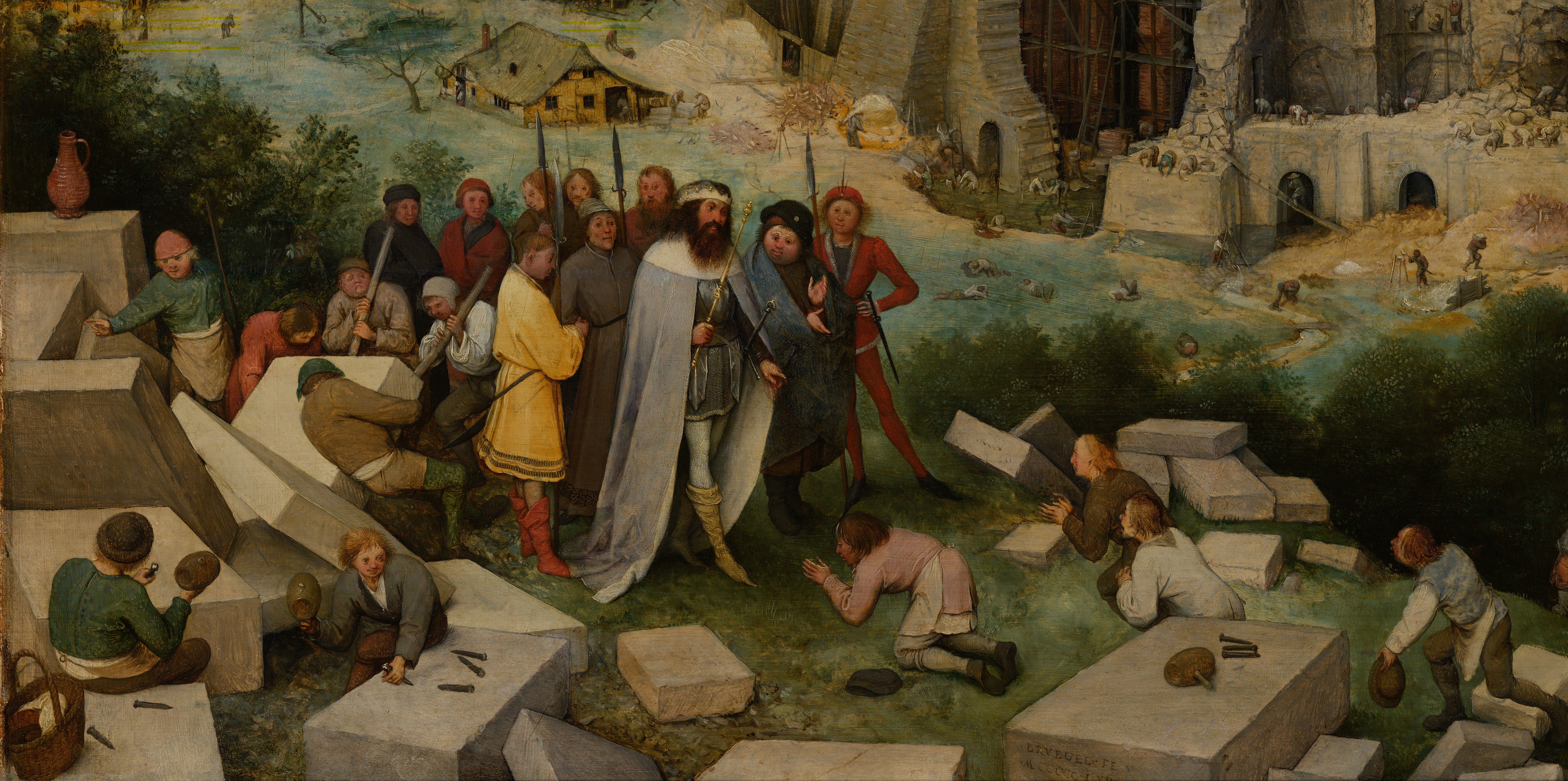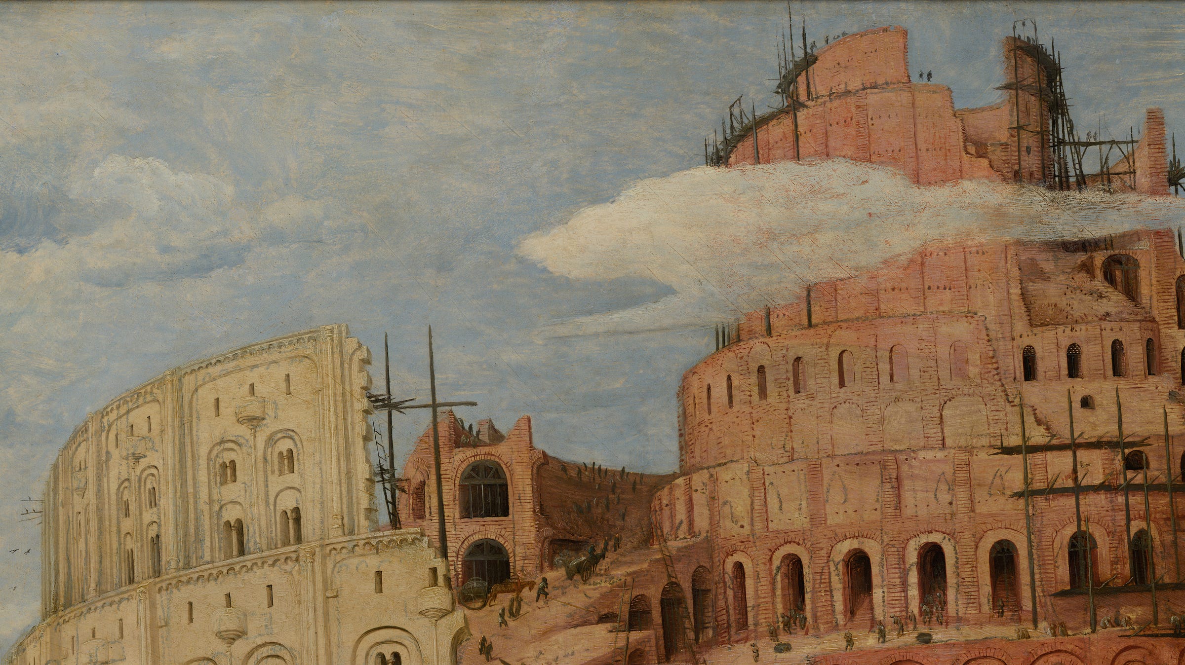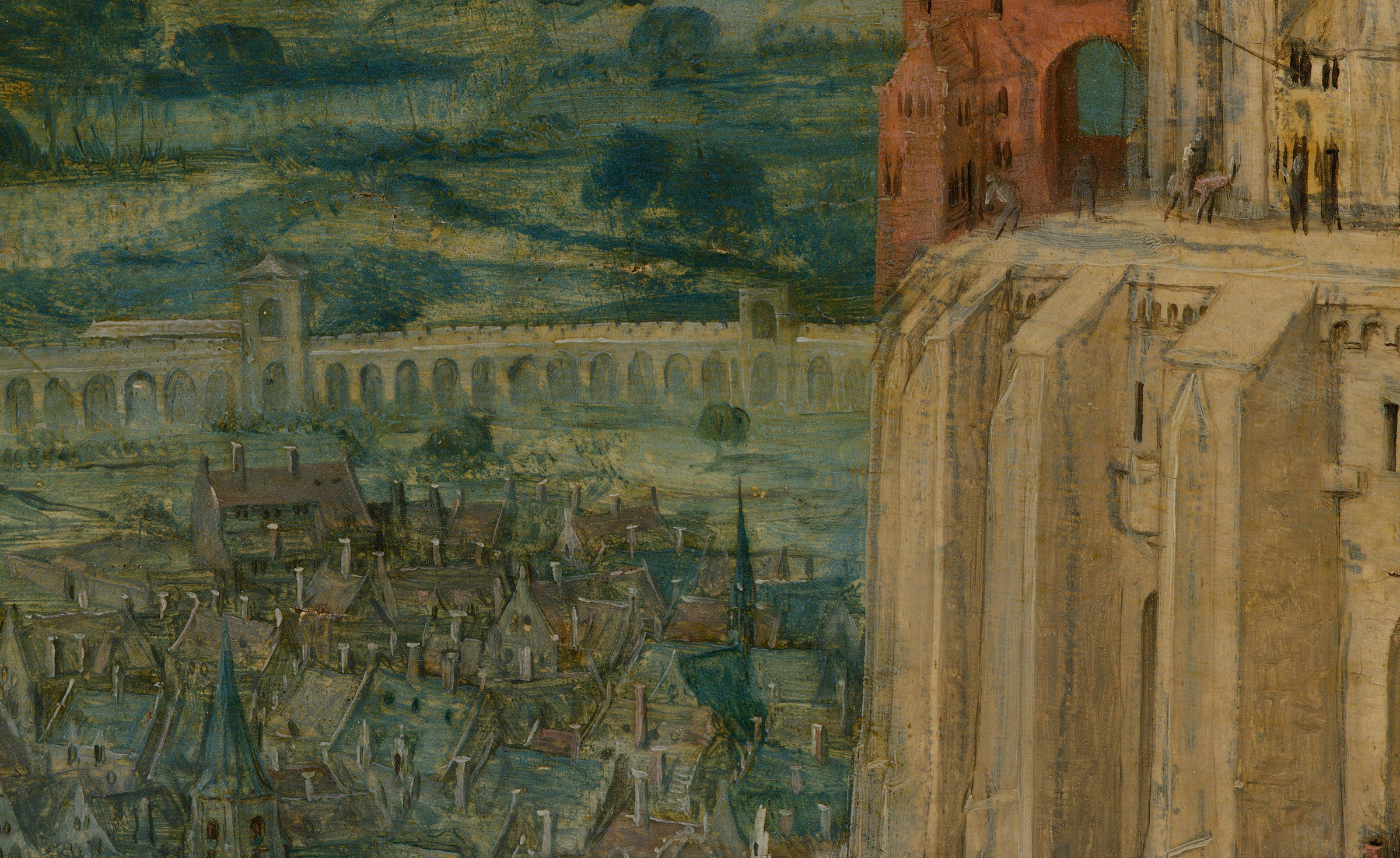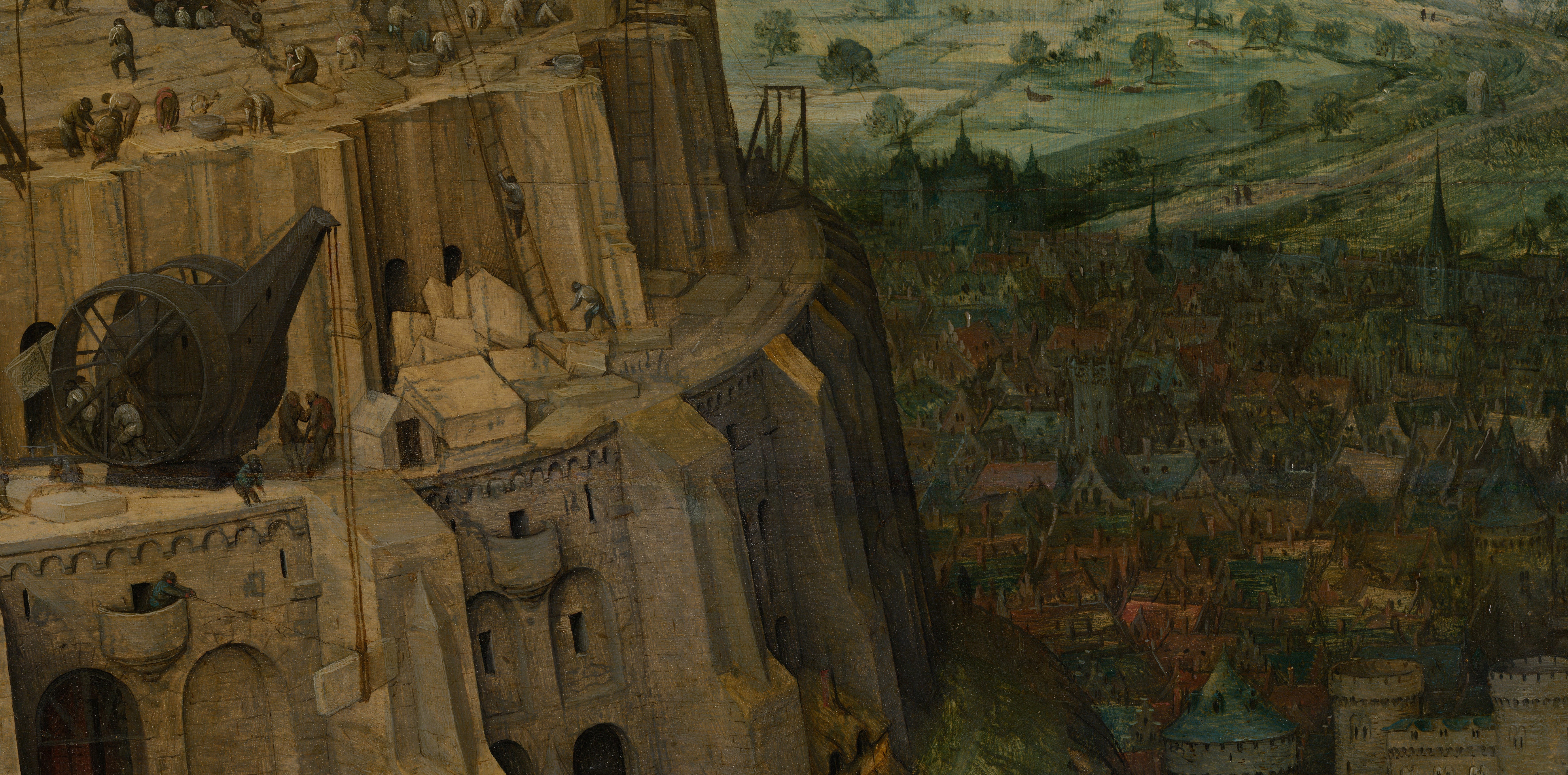 The city and the Tower it’s belittled by: Open in extreme wide as in Bruegel. The Tower’s grandeur, buttressed by port, city, sky, in its unfinished design figures ambition’s folly and imposture. Walk its several sides, it cannot be encircled. Remark how at every angle it seems absurdly self-similar until the sense becomes a sinking one that there are infinitely many sides. What need for it, though? Don’t we have them already? If it were up to me there wouldn’t be any. If it were up to me it’d’ve been done long ago. There was a time, it’s said, when they began it, brought together to set it down somewhere in the city where a Tower did not yet exist. No one can verify but all are free to add, brick by brick, their clarifications, and as it rises be raised by its immense awareness. But the Tower… it houses at its center a huge mass. It bends nature and our wills around it. Scabbing masonry, roads unfinished, overgrown, flights of stairwells, vaults and arches and crypts to peer into its darkness. Unmade, yet among arcades, a space where a temple’s falseworks lay, how it might have looked one day if there were a sacred, needful place… One age culminates in astonishment, then turns to stony reverence. The next inherits it, unimpressed, often incredulous. They too are on their way to astonishment. They will take up the work and fashion it in their own image, an image of the same Tower, layer upon layer, recursive. Golden in ratio. Always unfinished yet symmetrical. Ancient and new. Answering a dreamy prayer. Cleaving heaven in two. The Tower’s myth the boy made real the granted wish. Wisdom is in remembering this. So colossal so hyperbolical those who work one side do not know what on the other side goes on. The right hand does not know its left. Yet we’re certain we know our neighbors are not like ourselves. Men know their neighbors better than themselves. It will not be finished in our lifetime. It may not be finished in any timeline. Still it rises. Still it’s raised. Still spacetime ekes out infinity never knowing itself completely for we’ve arrived cosmically and what there is to know cannot be known by accident. The right hand will never know its left.